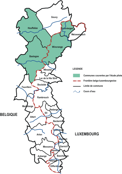 - Wallonie: Houffalize et Bastogne (338 km2) - Luxembourg: Troisvierges et Wincrange (151 km2)